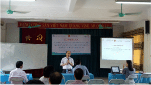 (Hình 7: Bảo vệ nghiệm thu đề tài ““Nghiên cứu, đánh giá thực trạng hệ số công suất Cosφ, tính toán nâng cao hệ số Cosφ và thiết kế, lắp đặt tủ điện tự động bù công suất phản kháng.”Do Đỗ Triều Dương – chủ nhiệm đề tài)