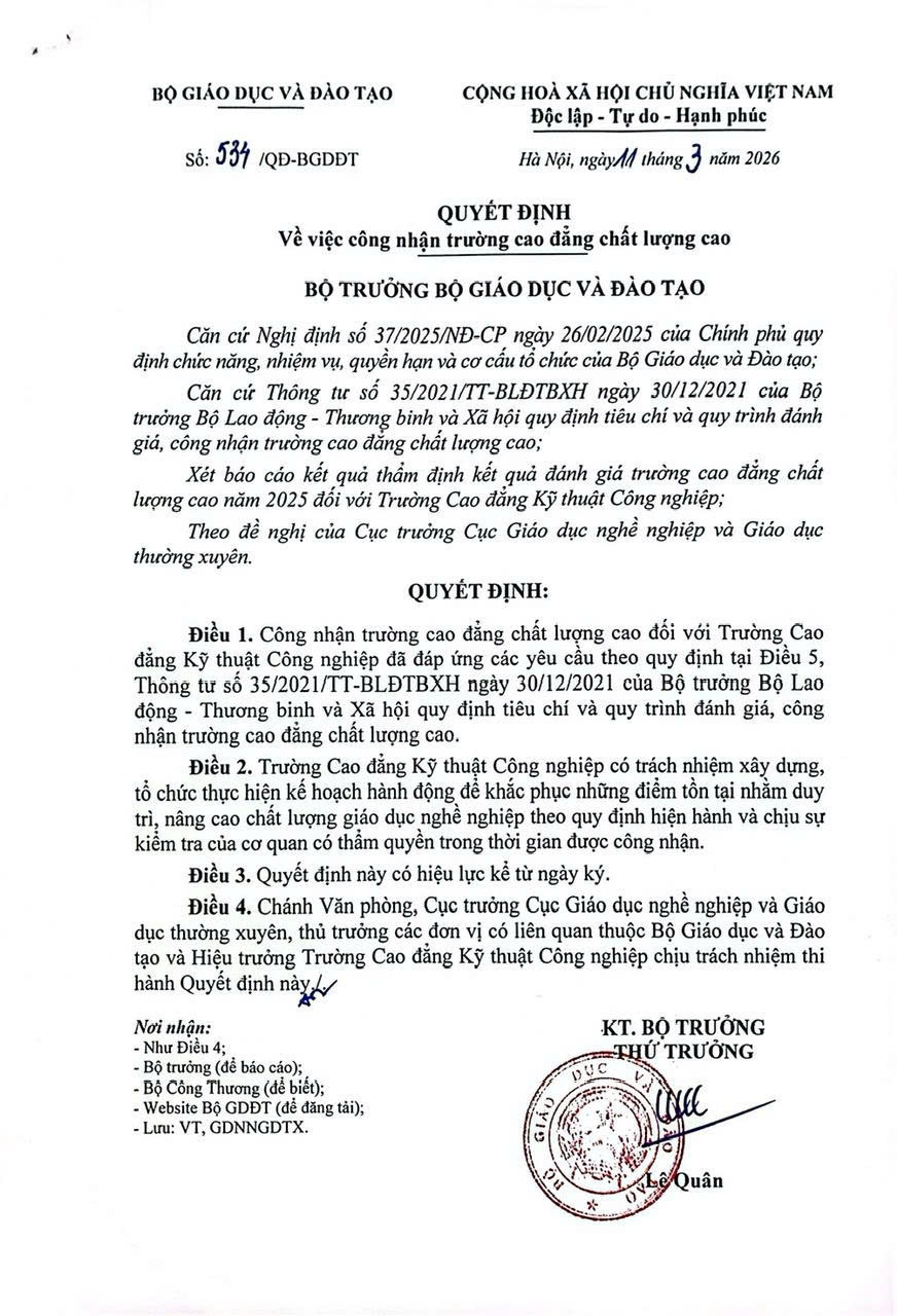 Ngày 11/3/2026, Bộ GD&ĐT đã ban hành Quyết định số 534/QĐ-BGDĐT về việc công nhận trường Cao đẳng chất lượng cao đối với Trường Cao đẳng Kỹ thuật Công nghiệp (BCIT). Đây là vinh dự lớn với BCIT đồng thời là sự ghi nhận xứng đáng của Bộ GD&ĐT với những nỗ lực không ngừng của thầy và trò nhà trường, với sứ mệnh đào tạo nguồn nhân lực chất lượng cao phục vụ cho sự phát triển của đất nước và hội nhập quốc tế.